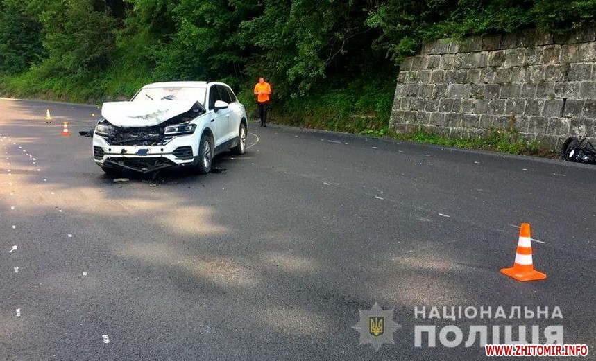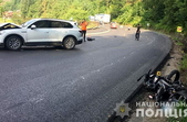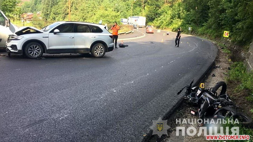 «Аварія трапилась в Яремчі, внаслідок лобового зіткнення легковика з мотоциклом одна людина загинула. Правоохоронці розпочали кримінальне провадження.6 липня о 07:15 на дорозі Н-09 в Яремчі сталася смертельна ДТП. Виїздом правоохоронців попередньо встановлено, що 25-річний водій Volkswagen Touareg рухався у напрямку Микуличина, але на заокругленій ділянці дороги не справився з керуванням і виїхав на смугу зустрічного руху. Внаслідок такого маневру автомобіль зіткнувся з мотоциклом Bajaj Pulsar NS200. Останнім транспортним засобом керувала 32-річна мешканка Києва, яка від отриманих травм загинула на місці аварії. Водій автомобіля, уродженець Києва, не травмувалися, в автівці їхав сам. У керманича відібрано кров на перевірку стану сп’яніння. Результат підтвердив, що він перебував напідпитку – 1,19 проміле. За фактом аварії слідчими розпочато кримінальне провадження за ч. 3 ст. 286-1 Кримінального кодексу України. Водія затримано у порядку ст. 208 Кримінально-процесуального кодексу України. Проводиться досудове розслідування, правоохоронці встановлюють обставини», - повідомила про ДТП поліція ГУНП в Івано-Франківській області.