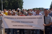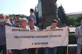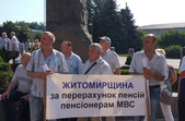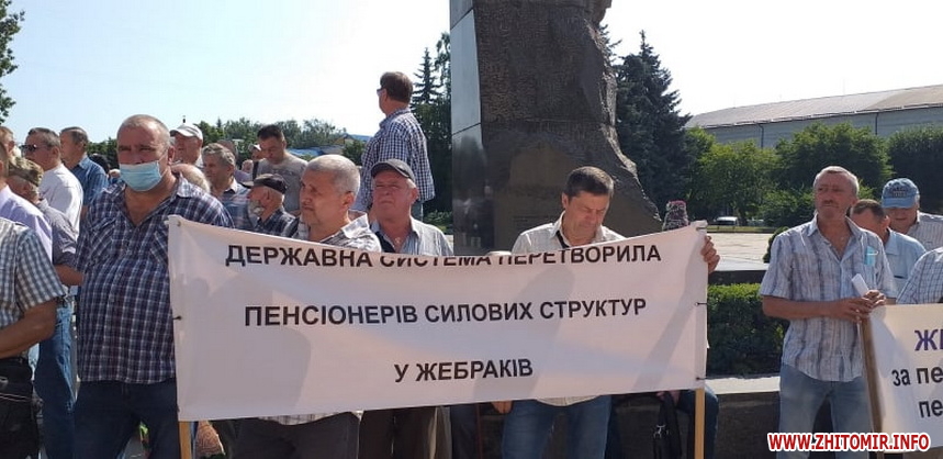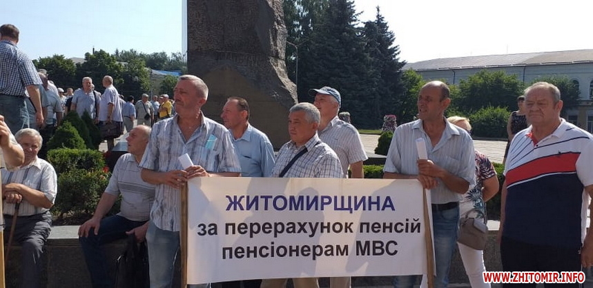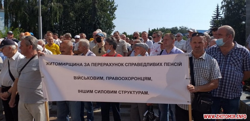 На початку робочого дня 14 липня біля будівлі Житомирської облдержадміністрації зібралося кілька десятків людей. Дехто тримає плакати з написами: «Житомирщина за перерахунок пенсій пенсіонерам МВС», «Державна система перетворила пенсіонерів силових структур у жебраків», «Житомирщина за перерахунок справедливих пенсій військовим, правоохоронцям, іншим силовим структурам».