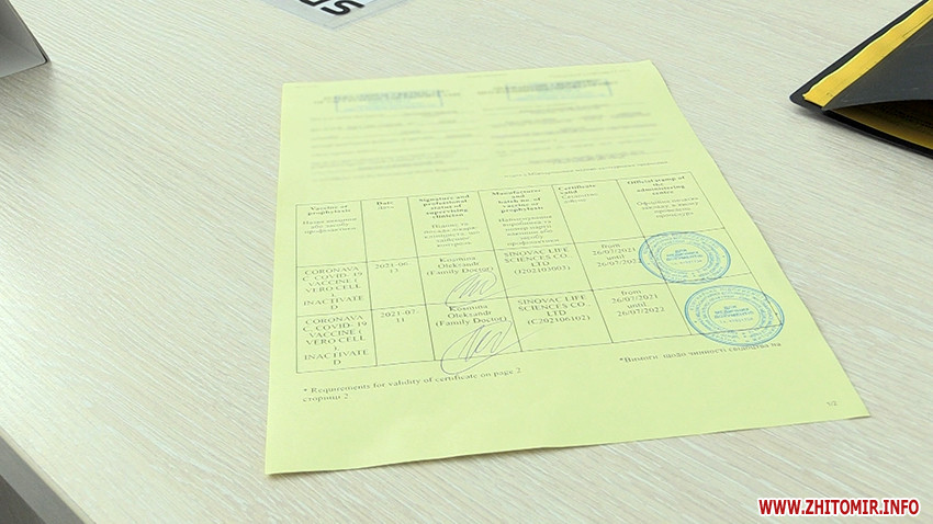 Житомиряни, які отримали дві дози вакцини від COVID-19, можуть отримати міжнародний сертифікат про вакцинацію. У документ вносять дату вакцинації, назву вакцини та номер закордонного паспорта. Інформацію заповнюють двома мовами: українською та англійською. Дійсний сертифікат протягом одного року.