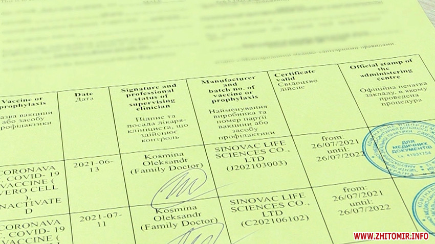 «Міжнародний сертифікат з вакцинації видається після введення, якщо це двохдозна, після введення другої дози, може віддаватися одразу, тобто в систему одразу вносяться дані про вакцинацію. Через те, що ми проводимо щеплення в центрі масової вакцинації населення, але у нас немає можливості поставити ще окремо співробітників для з принтерами для видачі цих свідоцтв, ми скеровуємо до сімейних лікарів. Тобто, якщо це щеплення було проведено на вихідних, з понеділка можуть звернутися до сімейного лікаря. Якщо дані всі внесені, вони з’являються відразу в медичній інформаційній системі, де лікар сімейний може роздрукувати й поставити підпис та печатки закладу на цьому свідоцтві», – розповів директор центру вакцинації у Житомирі Олександр Косміна.