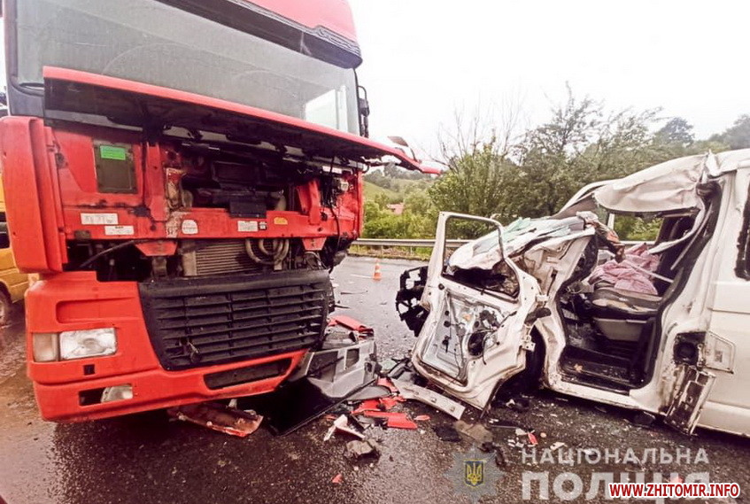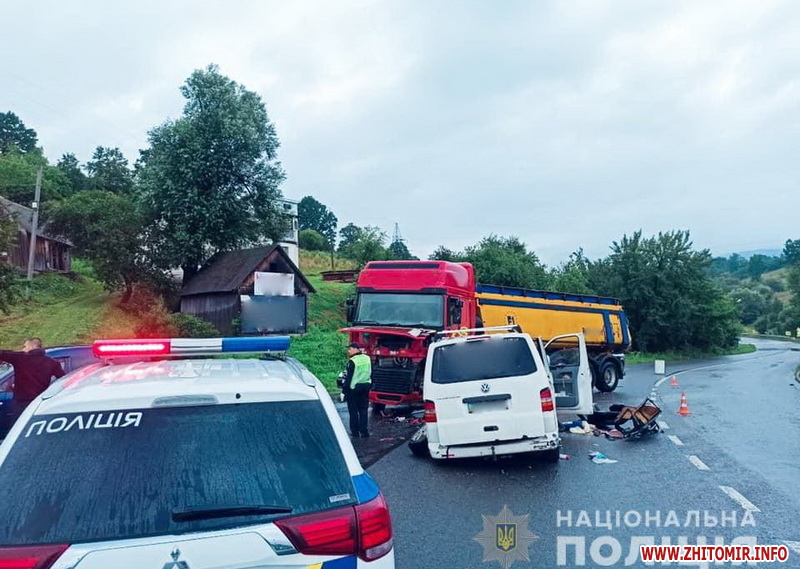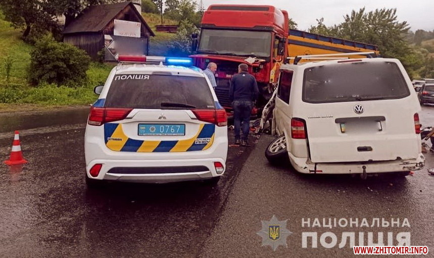 У результаті аварії до лікарні доставлено водія автомобіля «Volkswagen Transporter» і семеро пасажирів віком 38, 17, 15, 13, 11 (дві особи) і 8 років, які є мешканцями Житомирщини.