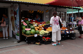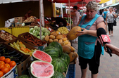 «Кавун –15 грн, диня – 16 грн. Я обираю кавун стукаючи. Велика пляма на протилежному від хвостика боці — це кавуничка. Щоб обрати диню потрібно нажати в межах плодоніжки, якщо там м’яке місце – буде класна диня. Диню можна ще обирати за запахом, а кавун потрібно стукати, має бути дзвінкий звук. Ціни цього року дорожчі, все дорожче», — каже продавчиня Марина.