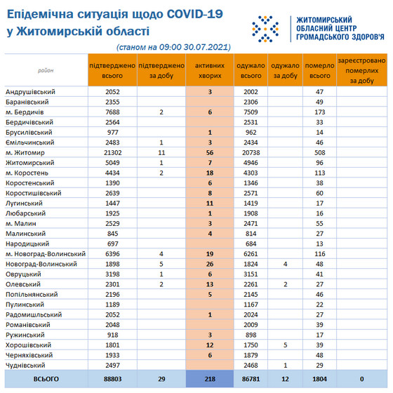 Станом на 9:00 год. 30 липня 2021 року в Житомирській області лабораторно підтвердили 88803 випадки коронавірусної хвороби. За минулу добу, 29 липня, було зареєстровано 29 нових інфікувань COVID-19. За період пандемії від ускладнень хвороби померли 1804 пацієнти (0 – за минулу добу). Всього одужав 86781 житель області, нині активних хворих – 218 осіб.