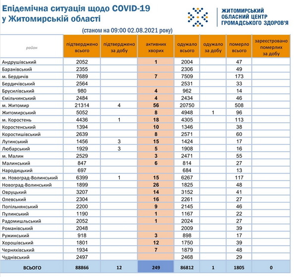 Станом на 9:00 год. 2 серпня 2021 року в Житомирській області лабораторно підтвердили 88866 випадків коронавірусної хвороби. За минулу добу, 1 серпня, було зареєстровано 12 нових інфікувань COVID-19. За період пандемії від ускладнень хвороби померли 1805 пацієнтів (0 – за минулу добу). Всього одужали 86812 жителів області, нині активних хворих – 288 осіб.