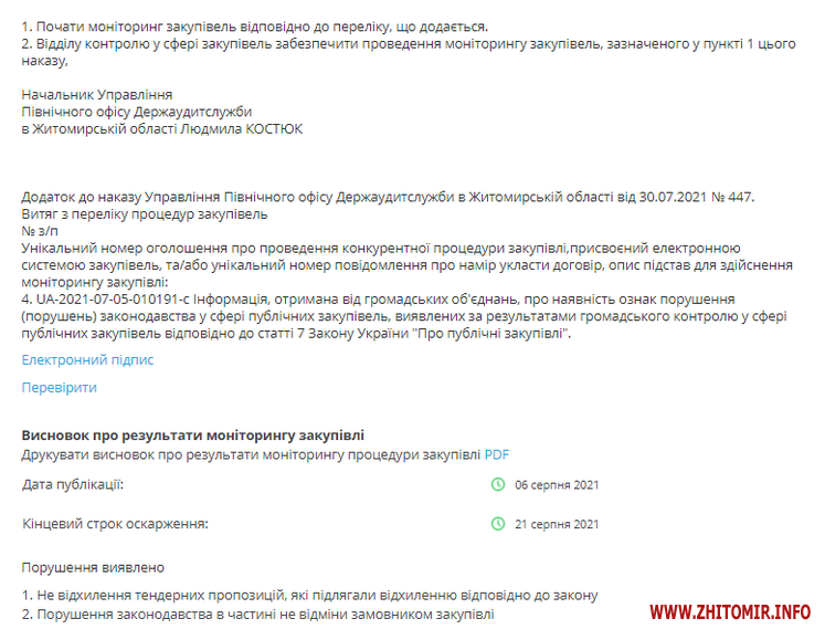 «З огляду на встановлені порушення законодавства у сфері закупівель, керуючись статтями 2 та 5 Закону України «Про основні засади здійснення державного фінансового контролю в Україні», Управління Північного офісу Держаудитслужби в Житомирській області зобов’язує здійснити заходи щодо усунення виявлених порушень у встановленому законодавством порядку, зокрема, в межах законодавства вжити заходів щодо припинення зобов’язання за договором від 04.08.2021 року № 227 відповідно до норм частини 2 статті 202 Господарського кодексу України, з дотриманням положень Господарського кодексу України і Цивільного кодексу України та протягом п’яти робочих днів з дня оприлюднення висновку оприлюднити через електронну систему закупівель інформацію та/або документи, що свідчать про усунення порушень законодавства у сфері публічних закупівель, викладених у висновку, або аргументовані заперечення до висновку, або інформацію про причини неможливості усунення виявлених порушень», - йдеться у висновку за результатами моніторинг, оприлюдненому 6 серпня.