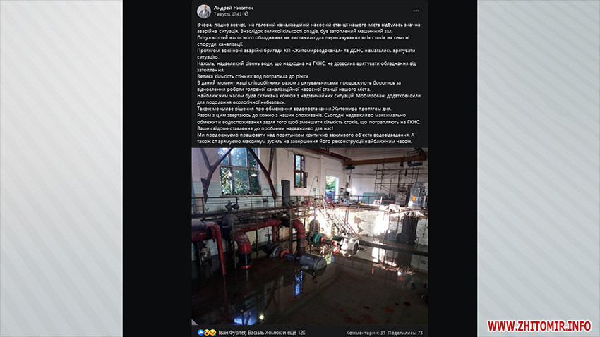 У ніч на 7 серпня у Житомирі сталася аварія на колекторі головної каналізаційної насосної станції, через яку у річку Тетерів потрапили неочищені стоки. Сьогодні, 9 серпня, директор КП «Житомирводоканал» Андрій Нікітін розповів, як аварія вплинула на якість води в річці та, як підприємство відновлюватиме роботу.