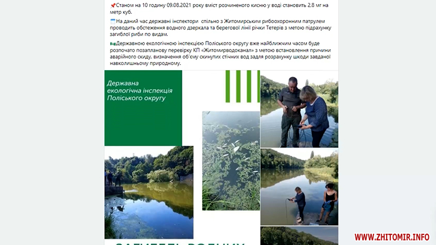«Станом на 10 годину 09.08.2021 року вміст розчиненого кисню у воді становить 2,8 мг на метр куб (при нормі не менше 4 мг на метр кубічний). На даний час державні інспектори спільно з Житомирським рибоохоронним патрулем проводить обстеження водного дзеркала та берегової лінії річки Тетерів з метою підрахунку загиблої риби по видах. Державною екологічною інспекцією Поліського округу вже найближчим часом буде розпочато позапланову перевірку КП «Житомирводоканал» з метою встановлення причини аварійного скиду, визначення об’єму скинутих стічних вод задля розрахунку шкоди завданої навколишньому природному», - повідомляє Державна екологічна інспекція Поліського округу.