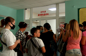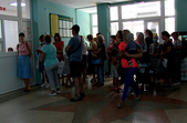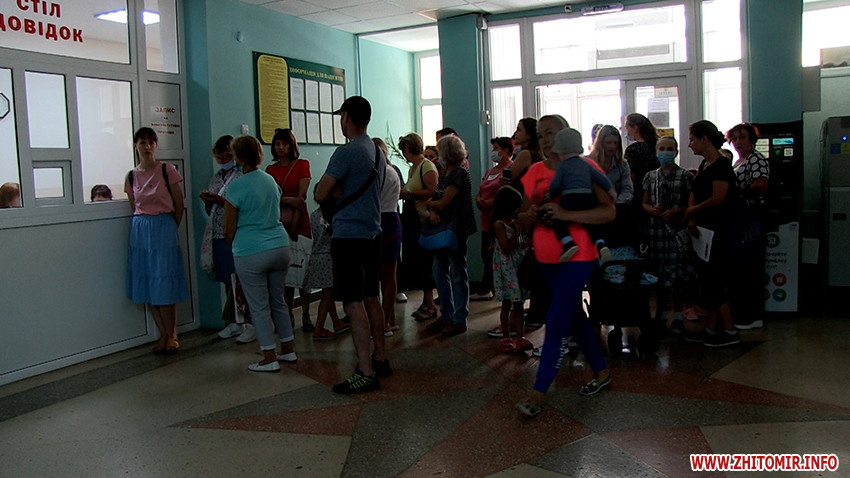 У Житомирській дитячій поліклініці на вулиці Святослава Ріхтера в обідню пору утворилася величезна черга. Батьки намагаються записати свою дитину на прийом до лікаря, проте не можуть цього зробити, ані через електронний запис, ані через живу чергу.