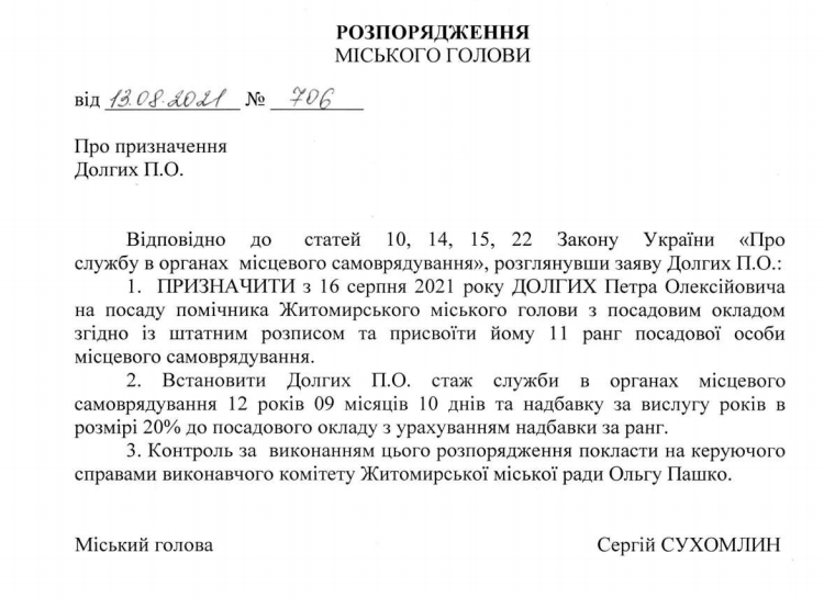 «Призначити з 16 серпня 2021 року Долгих Петра Олексійовича на посаду помічника Житомирського міського голови з посадовим окладом згідно зі штатним розписом та присвоїти йому 11 ранг посадової особи місцевого самоврядування. Встановити Долгих П.О, стаж служби в органах місцевого самоврядування 12 років 9 місяців 10 днів та надбавку за вислугу років в розмірі 20% до посадового окладу з урахуванням надбавки за ранг», - йдеться у розпорядженні.
