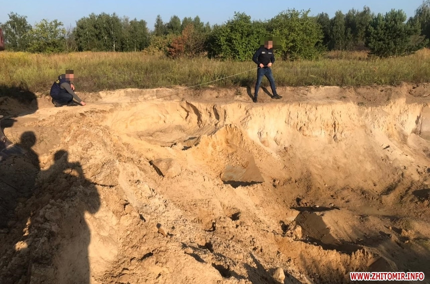 «Під час обшуків, проведених працівниками поліції за оперативного супроводу Управління стратегічних розслідувань в області ДСР Нацполіції України виявлено та вилучено автотехніку, незаконно видобутий пісок, бухгалтерську документацію, товаро-транспортні накладні, чорнові записи.Установлено, що група місцевих жителів на земельній ділянці сільськогосподарського призначення приватної власності площею 6,2 га,розташованій на території Хотинівської сільської ради Коростенського району, за допомогою спецтехніки зняли родючий шар ґрунту та видобували пісок, унаслідок чого утворився майже п’ятиметровий кар’єр площею 0,53 га.За попередніми підрахунками екологів, незаконним видобутком піску державним інтересам завдано шкоди на понад 3 млн грн.