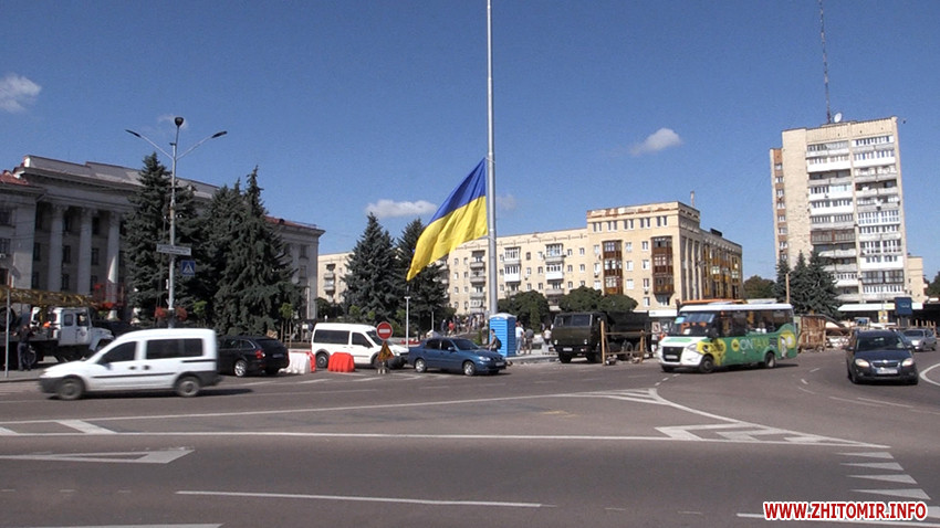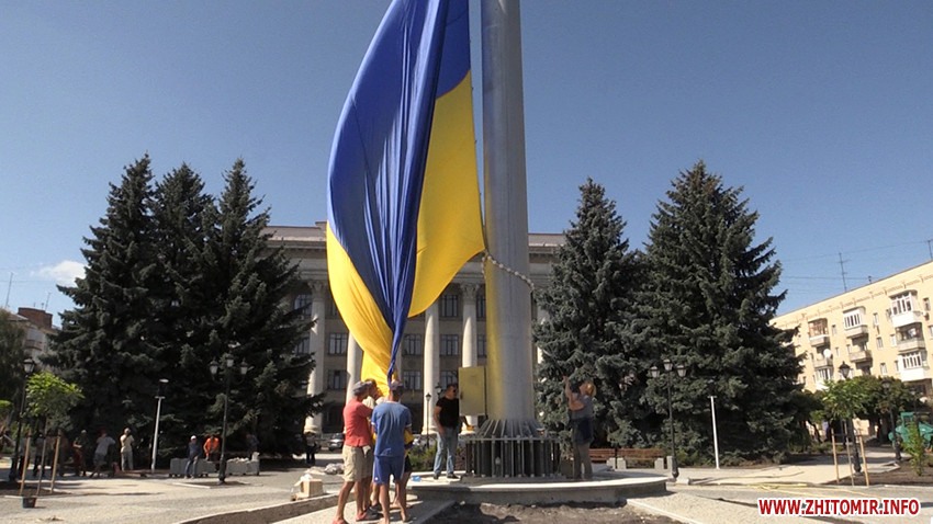 20 серпня у Житомирі на майдані Соборному замайорів синьо-жовтий стяг. За словами начальника управління капітального будівництва міської ради В’ячеслава Глазунова, підняття прапору відбулося у тестовому режимі. Сьогодні цей процес тривав майже 3 хвилини.
