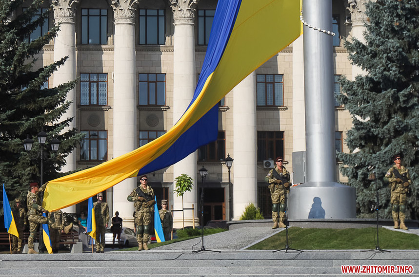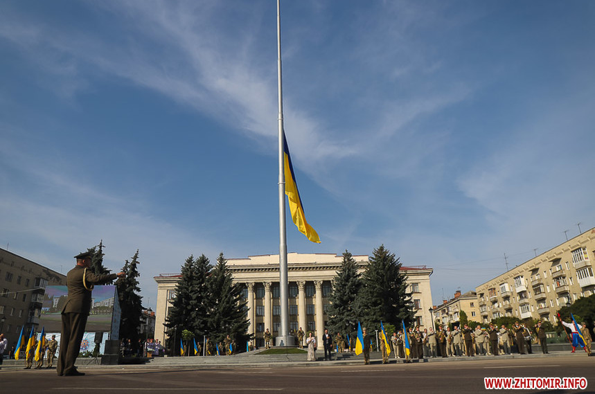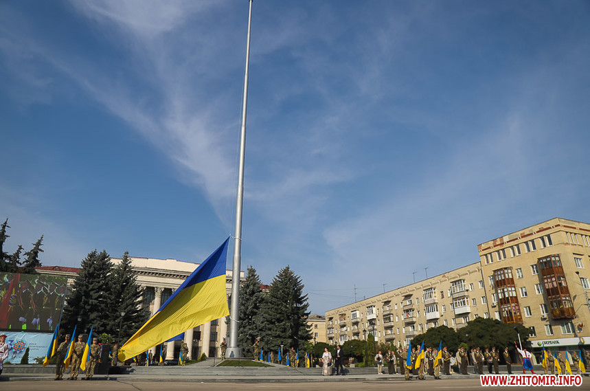 23 серпня Україна відзначає День Державного Прапора. Цьогоріч у Житомирі локація відзначення свята змінилася: зазвичай стяг піднімали на майдані Корольова, а сьогодні він замайорів на 50-метровому флагштоці, встановленому в оновленому сквері на майдані Соборному.