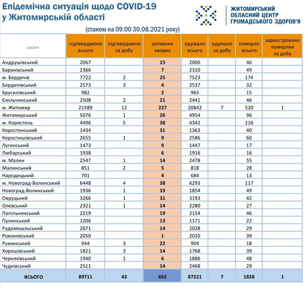Станом на ранок 30 серпня 2021 року в Житомирській області лабораторно підтверджено 89711 випадків коронавірусної хвороби, з них 43 виявлено впродовж минулої доби, 29 серпня. Усього зафіксували 1828 летальних випадків, спричинених ускладненнями COVID-19. Упродовж доби, що минула, померла одна людина.