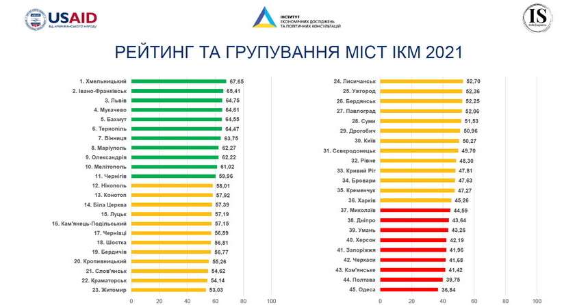 «Одинадцять міст – Хмельницький, Івано-Франківськ, Львів, Мукачево, Бахмут, Тернопіль, Вінниця, Маріуполь, Олександрія, Мелітополь та Чернігів є містами з найбільш сприятливим бізнес-кліматом та ефективним економічним врядуванням у цьому році. Такими є результати дослідження «Індекс конкурентоспроможності міст України (ІКМ) 2021», яке провела Програма USAID «Конкурентоспроможна економіка України» (КЕУ) спільно з компанією Інфо Сапієнс,Інститутом економічних досліджень та політичних консультацій. За результатами проведеного опитування та зібраних статистичних даних з міст, Інститутом економічних досліджень та політичних консультацій підготовлено звіт та рейтинг міст-учасників, а також проаналізовано показники ІКМ 2021 з минулорічними - ІКМ 2019/2020.Різниця у значеннях ІКМ для 1-го та 45-го місця зберігається великою - 67,65 до 36,84, також 27 з 45 міст увійшли до ТОП-6 найкращих міст як мінімум в одному з компонентів, що свідчить про суттєву різницю у діловому кліматі, політиці місцевих рад, та як результат, - конкурентоспроможності кожного міста», - йдеться в інформації.