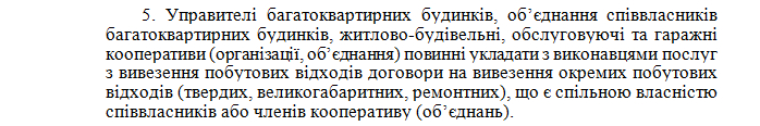Одним із пунктів правил передбачено, що «управителі багатоквартирних будинків, об’єднання співвласників багатоквартирних будинків, житлово-будівельні, обслуговуючі та гаражні кооперативи (організації, об’єднання) повинні укладати з виконавцями послуг з вивезення побутових відходів договори на вивезення окремих побутових відходів (твердих, великогабаритних, ремонтних), що є спільною власністю співвласників або членів кооперативу (об’єднань)».