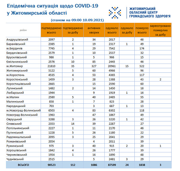 Станом на ранок 10 вересня 2021 року в Житомирській області лабораторно підтверджено 90523 випадки коронавірусної хвороби, з них 112 виявили упродовж минулої доби, 9 вересня. Загалом від ускладнень СOVID-19 в області померли 1838 людей, упродовж минулої доби зафіксували три летальні випадки.