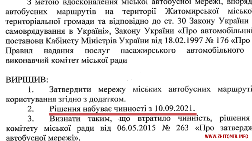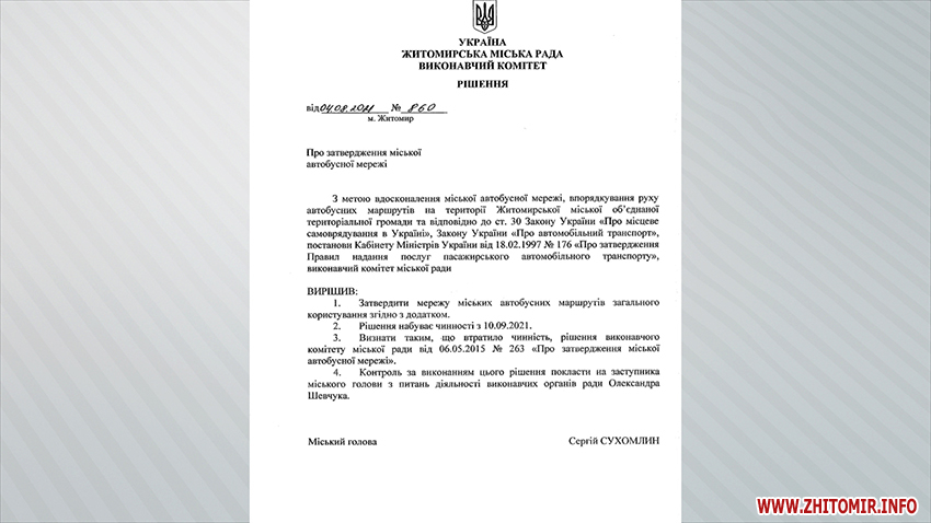 Як повідомляв Житомир.info, 4 серпня 2021 року члени Житомирського виконавчого комітету затвердили зміни в міській автобусній і тролейбусній мережах. Начальник управління транспорту та зв’язку Житомирської міської ради тоді зазначав, що внести зміни планують в тролейбусні маршрути, які курсують на Корбутівку та Богунію. А нова автобусна мережа передбачає часткові зміни схем руху на 14 автобусних маршрутах і запрацює з 10 вересня 2021 року.