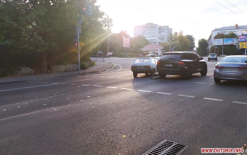 У Житомирі 13 вересня на вулиці Перемоги біля ЗОШ №6 сталася дорожньо-транспортна пригода за участі автомобілів Porsche Cayenne і «Таврія». Рух транспорту ускладнений.