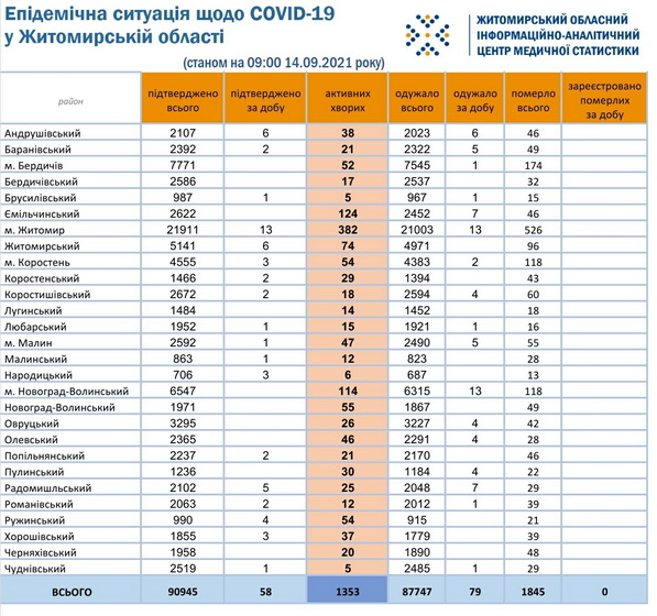 Станом на ранок 14 вересня 2021 року в Житомирській області лабораторно підтверджено 90945 випадків коронавірусної хвороби, з них 58 виявили упродовж минулої доби, 13 вересня. Загалом від ускладнень СOVID-19 в області померли 1845 людей, упродовж минулої доби летальних випадків зафіксовано не було.
