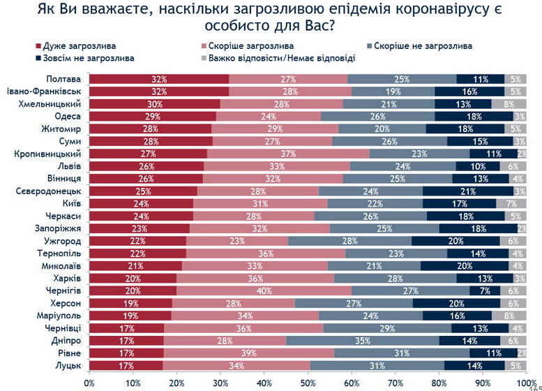 Серед опитаних 12% переймаються впливом COVID-19 на економіку та власний дохід (п’ятий показник серед обласних центрів), а 81% турбує вплив на особисте здоров’я та здоров’я сім’ї.