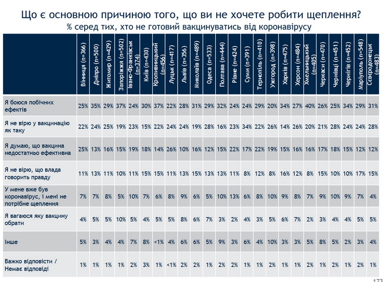 Ті ж житомиряни, які не готові вакцинуватися, називають три основні причини: бояться побічних ефектів (29%), взагалі не вірять у вакцинацію (25%) та думають, що вакцина недостатньо ефективна (16%).