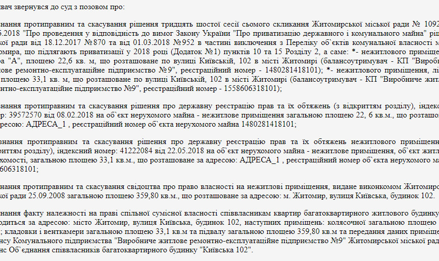 Зокрема, ОСББ просило визнати протиправним та скасувати свідоцтва про право власності на нежитлове приміщення, видане виконкомом Житомирської міської ради у вересні 2008 року загальною площею 359,80 кв.м., що розташоване за адресою: місто Житомир, вулиця Київська, будинок 102.
