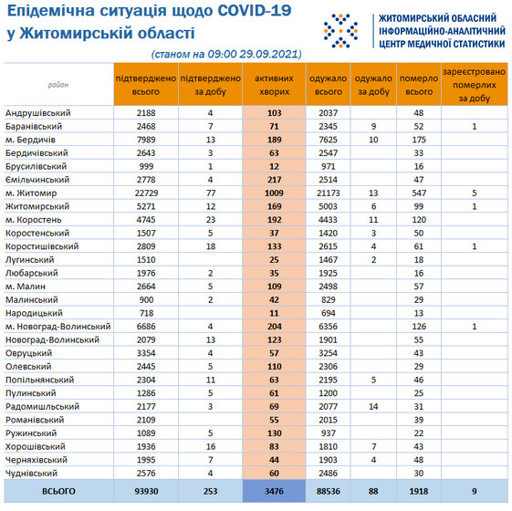 Станом на ранок 29 вересня 2021 року в Житомирській області лабораторно підтверджено 93930 випадків коронавірусної хвороби, з них 253 виявили упродовж минулої доби, 28 вересня. Загалом від ускладнень СOVID-19 в області померли 1918 людей, упродовж минулої доби зафіксували 9 летальних випадків.