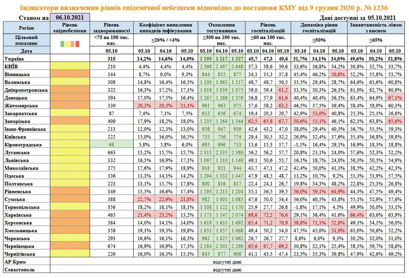 Станом на 5 жовтня Житомирська область має перевищення за двома показниками: коефіцієнт виявлених випадків інфікування, який повинен бути менш ніж 20%, а в наші області він вже три дні поспіль більший; рівень госпіталізації, який має становити менш ніж 60 на 100 тис. населення, 5 жовтня перевищений – 63,2%.