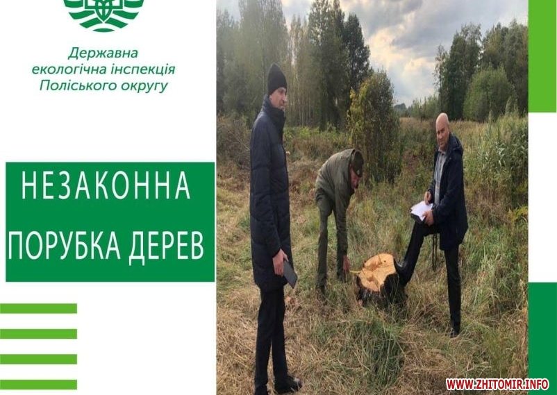 Державні інспектори з охорони навколишнього природного середовища Поліського округу спільно з працівниками Житомирського РУП здійснили виїзд до місця порубки, де виявили незаконну порубку 70 сироростучих дерев породи сосна, осика та вільха.