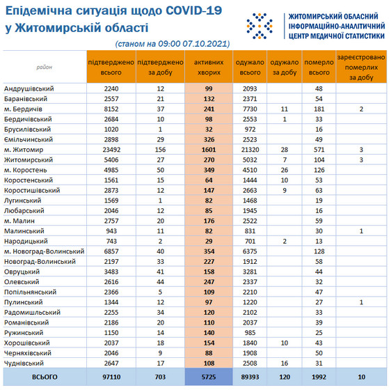 Станом на ранок 7 жовтня 2021 року в Житомирській області лабораторно підтверджено 97110 випадків коронавірусної хвороби, з них 703 виявили упродовж минулої доби, 6 жовтня. Загалом від ускладнень СOVID-19 в області померли 1992 людини, упродовж минулої доби зафіксували 10 летальних випадків.