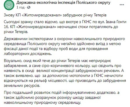 «Знову КП «Житомирводоканал» забруднює річку Тетерів. Сьогодні зранку стало відомо, що вкотре з ГКНС по вул. Івана Гонти 16, КП «Житомирводоканал» неочищені стоки потрапляють до річки Тетерів. Державними інспекторами з охорони навколишнього природного середовища Поліського округу негайно здійснено виїзд з метою фіксації даної події та відбору проб води для проведення лабораторних досліджень. Візуально, скид який тече до річки Тетерів має неприроднє забарвлення, а саме сіро-коричневого кольору, що свідчить про наявність в скиді великої концентрації забруднюючих речовин. А також виявлено, що за допомогою мотопомпи з ГКНС нечистоти відкачуються на рельєф місцевості, що призводить до забруднення земельних ресурсів. Про подальший розвиток подій інформуватимемо додатково, а також здійснимо розрахунок розміру шкоду завданої навколишньому природному середовищу», - йдеться у повідомленні.
