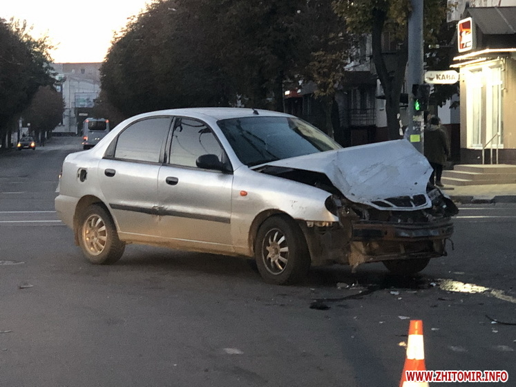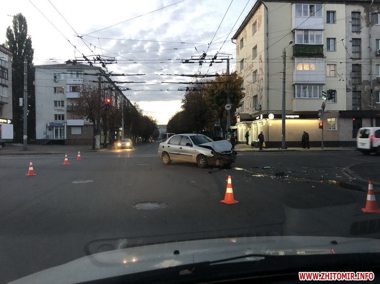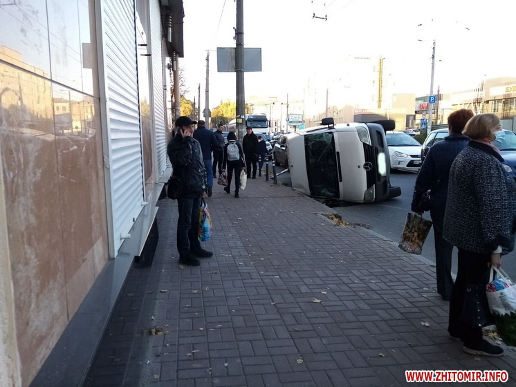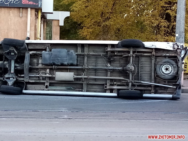 Вранці 8 жовтня на перехресті вулиць Покровської та Михайла Грушевського у Житомирі сталася дорожньо-транспортна пригода за участю легкового автомобіля та мікроавтобуса. Внаслідок зіткнення бус перевернувся.