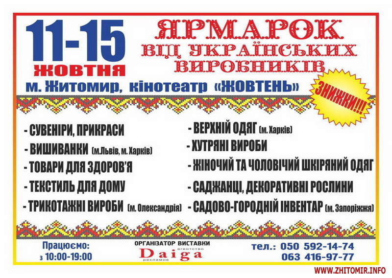 Чекаємо на Вас з 11 по 15 жовтня 2021 року, з 10:00 до 19:00 год., за адресою: м. Житомир, майдан Корольова, 11, кінотеатр «Жовтень».