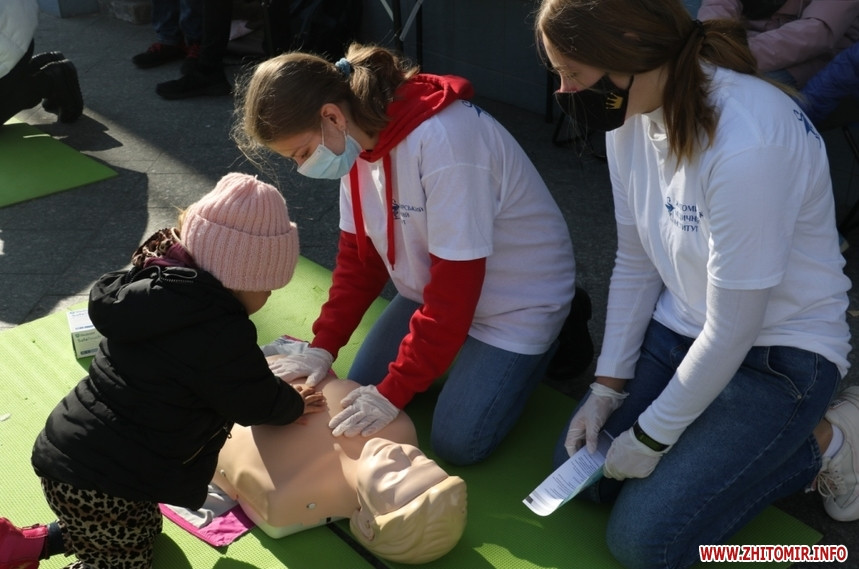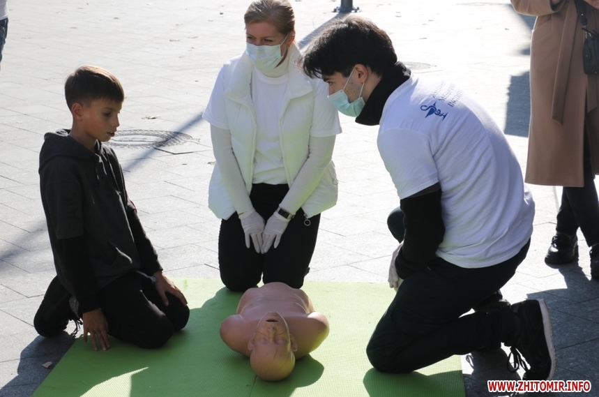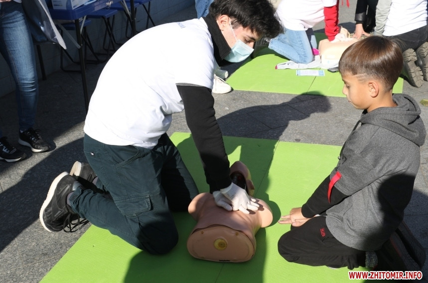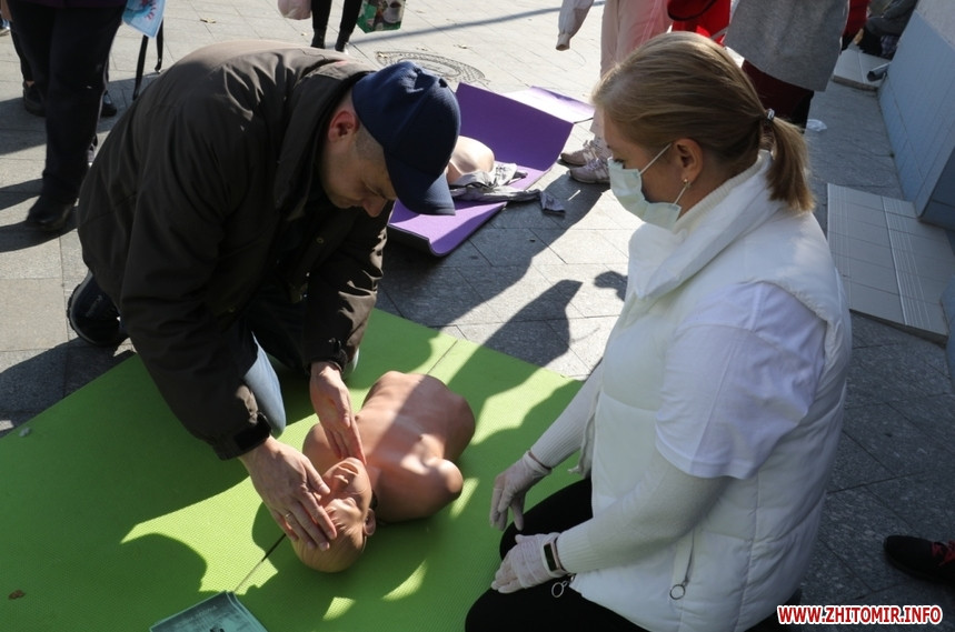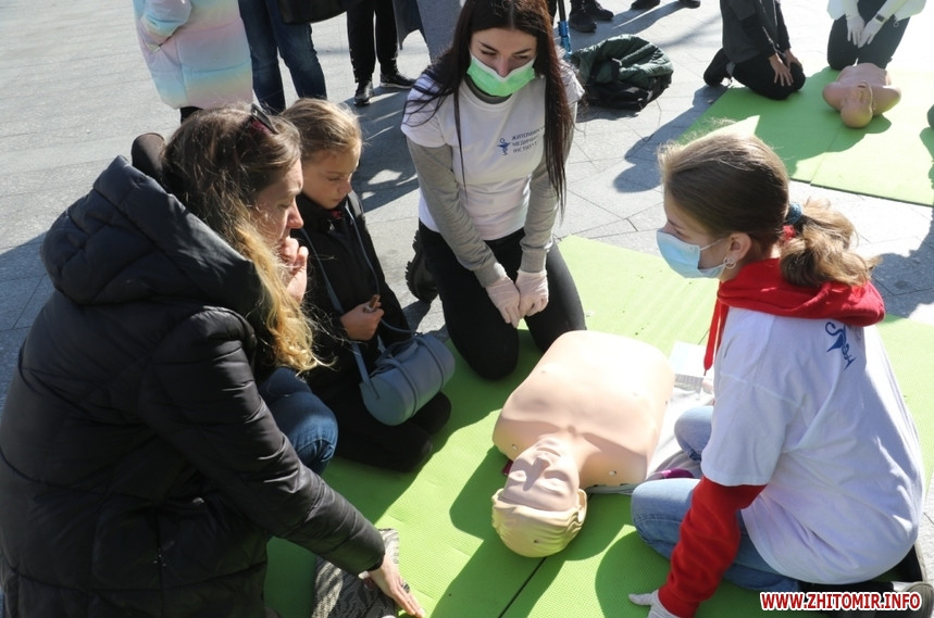 Оглядати хворого, визначати раптову зупинку серця, викликати бригаду медичної допомоги, а також правильно робити серцево-легеневу реанімацію навчали викладачі та студенти Житомирського медичного інституту, а також волонтери Товариства Червоного Хреста у Житомирі на Михайлівській 16 жовтня. Тут провели акцію присвячено Всесвітньому дню реанімації серця. На спеціальних манекенах студенти-медики демонстрували перехожим алгоритм реанімаційних заходів.