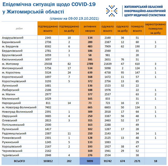 Станом на ранок 19 жовтня 2021 року в Житомирській області лабораторно підтверджено 103812 випадків коронавірусної хвороби, з них 202 виявили упродовж минулої доби, 18 жовтня. Загалом від ускладнень СOVID-19 в області померла 2171 людина, упродовж минулої доби зафіксували 18 летальних випадків.