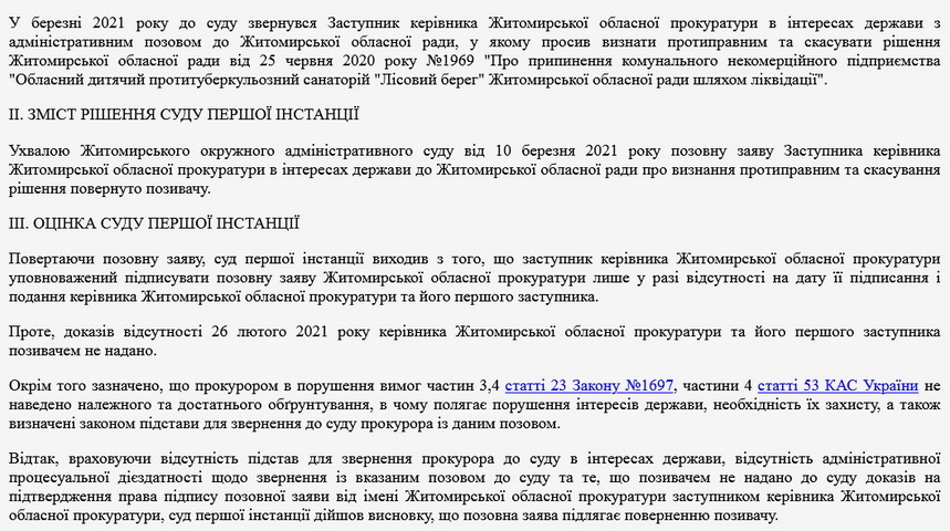 Заступник керівника Житомирської обласної прокуратури звернувся до суду з позовом до Житомирської обласної ради, в якому просить визнати протиправним та скасувати рішення облради від 25.06.2020 №1969 «Про припинення комунального некомерційного підприємства «Обласний дитячий протитуберкульозний санаторій «Лісовий берег» Житомирської обласної ради шляхом ліквідації».