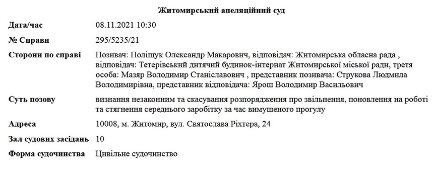Ухвалою від 29 вересня 2021 року Житомирський окружний адміністративний суд відкрив спрощене позовне провадження в адміністративній справі за позовом прокуратури до обласної ради. Чергове засідання призначене на 8 листопада 2021 року.