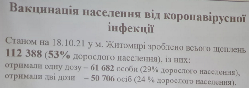 Нагадаємо, станом на 30 вересня у Житомирі було вакциновано від COVID-19 101 тисячу містян, тобто приблизно 40% від усього населення міста.