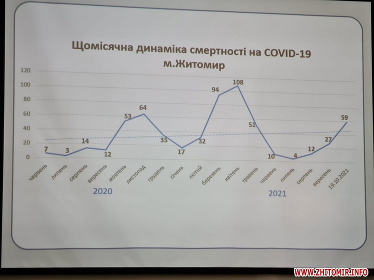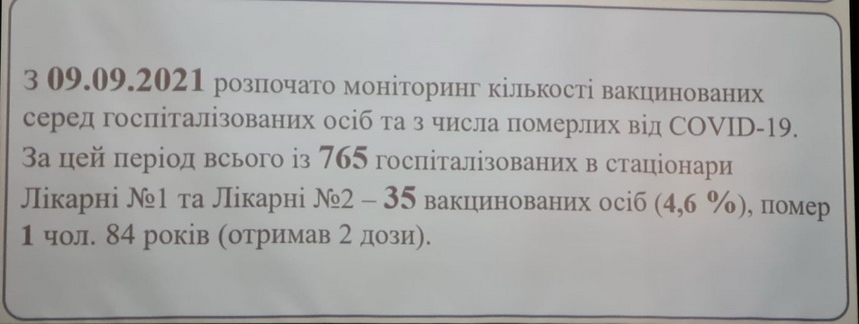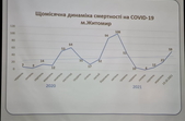 З її слів, за вказаний період (з 9 вересня по 19 жовтня) у Житомирі зафіксували один летальний випадок серед пацієнтів, які хворіли на COVID, хоч і були вакциновані.