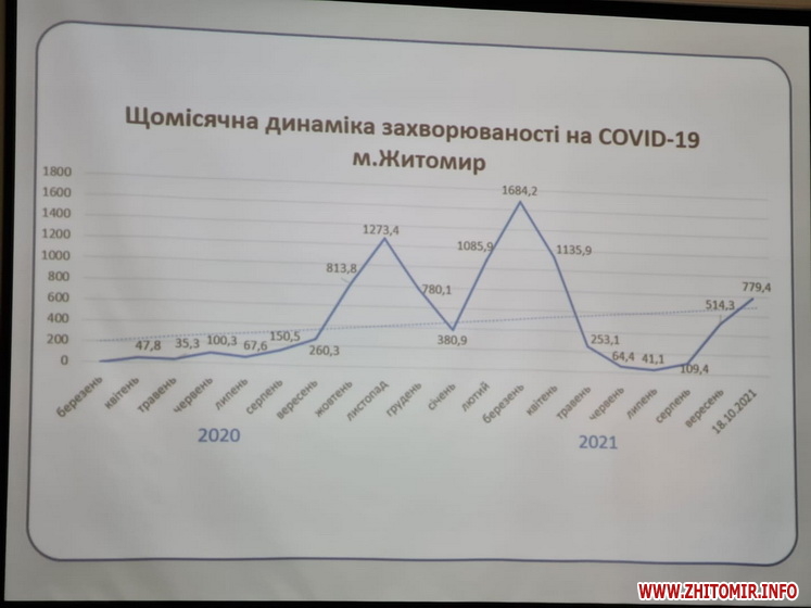 Починаючи з 9 вересня 2021 року в Житомирі ведуть статистику стосовно кількості пацієнтів, які захворіли на коронавірус та були госпіталізовані до місцевих лікарень, хоч і мали щеплення проти COVID-19. Таких пацієнтів приблизно 5%.