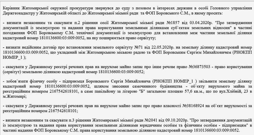 Керівник Житомирської окружної прокуратури звернувся до суду з позовом в інтересах держави в особі головного управління Держгеокадастру у Житомирській області до Житомирської міської ради та ФОП Боровського С.М., в якому просить: