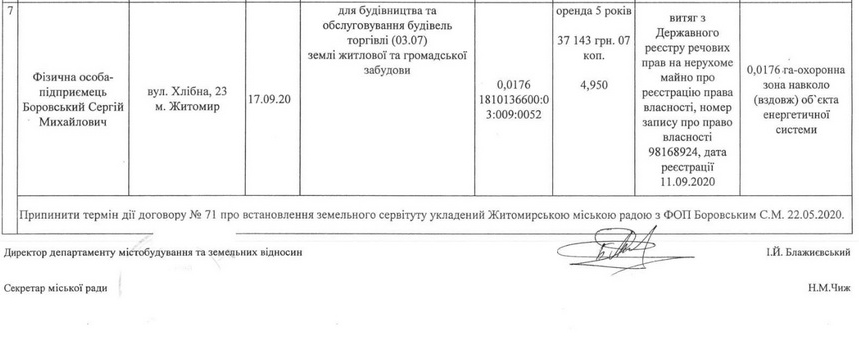 На сесії міської ради 9 жовтня 2020 року додаток до проєкту рішення «Про затвердження документацій із землеустрою та надання права користування земельними ділянками юридичним особам та фізичним особам-підприємцям» за пропозицією погоджувальної ради та земельної комісії, членом якої був депутат Михайло Боровський, доповнили пунктом про надання ФОП Боровський С.М. права користування земельною ділянкою на вул. Хлібна, 23. Депутати 24 голосами цю пропозицію підтримали.