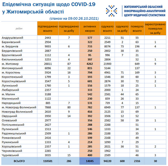 Станом на ранок 26 жовтня 2021 року в Житомирській області лабораторно підтверджено 110581 випадок коронавірусної хвороби, з них 286 виявили упродовж минулої доби, 25 жовтня. Загалом від ускладнень СOVID-19 в області померли 2316 людей, упродовж минулої доби зафіксували 30 летальних випадків.