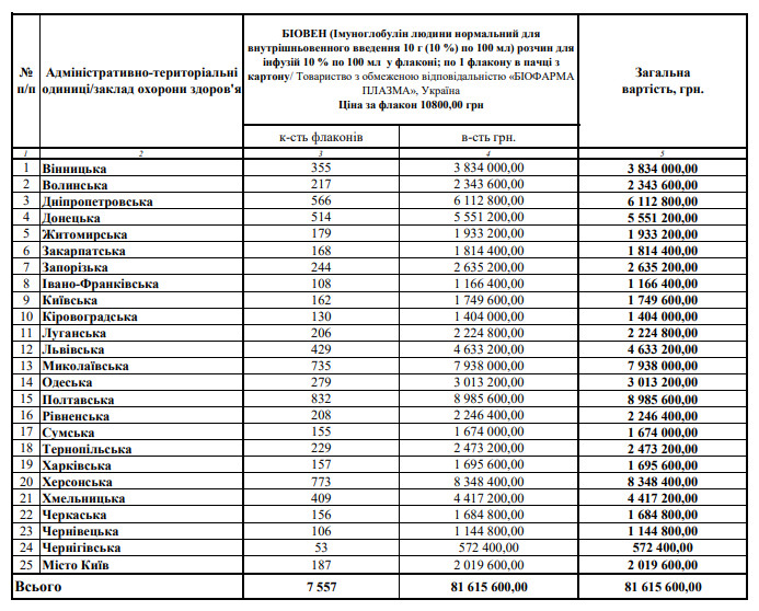 Загалом планується розвезти 7 557 флаконів, що має покрити 100% потреб. Відповідно до розподілу, Житомирська область отримає 179 флаконів препарату «БІОВЕН» загальною вартістю 1 933 200 грн (ціна за один флакон – 10 800 грн).