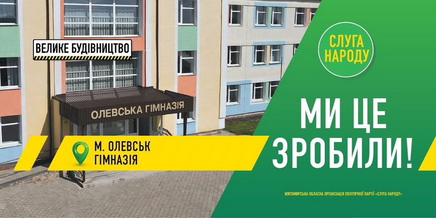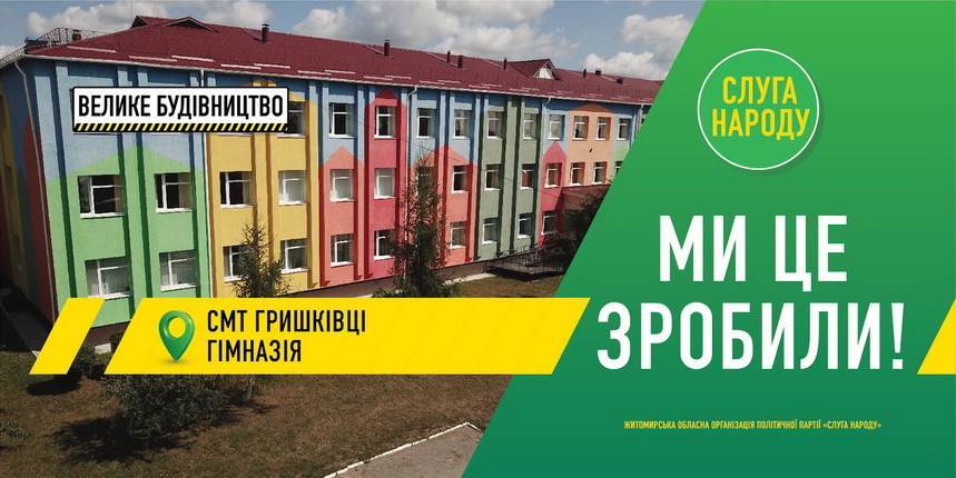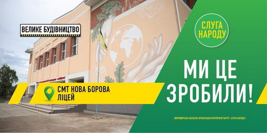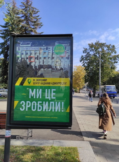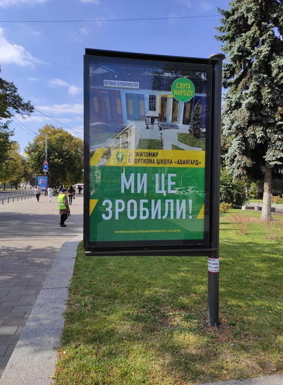 Вулиці Житомира обвішані зеленими плакатами: так команда президента на білбордах та сітілайтах звітує про «здобутки» проєктів «Великого будівництва». Також ці «здобутки» депутати «Слуг народу» активно постять в соціальних мережах. На зовнішній рекламі розміщені вже побудовані або реконструйовані об’єкти, які маркують під програму президента України Володимира Зеленського «Велике будівництво».