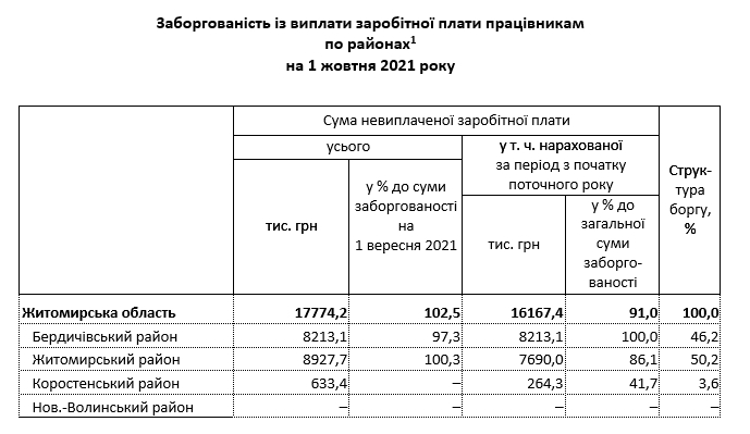 Станом на 1 жовтня 2021 року сума заборгованості з виплати заробітної плати в Житомирській області становила 17,8 млн грн.
