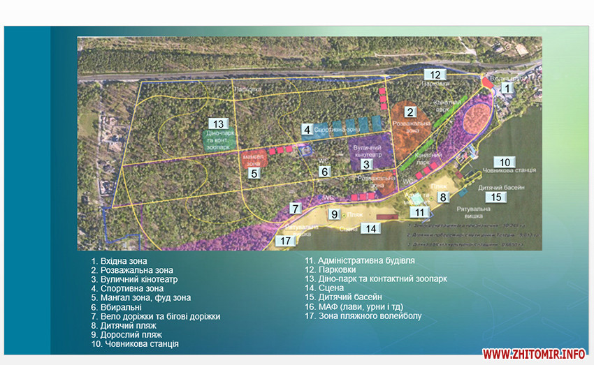 Як повідомляв Житомир.info, на початку лютого 2021 року мер Житомира Сергій Сухомлин розповідав про плани за два роки реконструювати гідропарк і розбити його на зони для різних видів відпочинку. 16 лютого новопризначена головна архітекторка Житомира Ольга Бронштейн на засіданні робочої групи презентувала напрацювання щодо реконструкції гідропарку: створення на території парку спортивної й розважальної зон, вуличного кінотеатру, канатного парку тощо. У 2021 році міська влада збиралася провести конкурс на ескізні роботи по реконструкції гідропарку і в 2022 році отримати фінансування з державного бюджету на реалізацію цього проєкту. На «Майстерні міста» 24 червня головна архітекторка Житомира Ольга Бронштейн представила концепцію реконструкції гідропарку, урбан-парку в ній не було (нижче фото з презентації концепції реконструкції гідропарку).