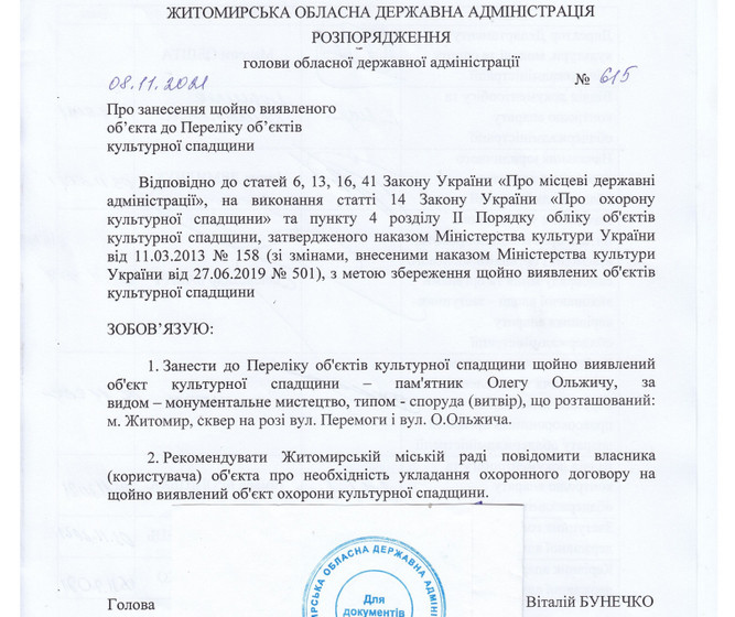 «Занести до Переліку об’єктів культурної спадщини щойно виявлений об’єкт культурної спадщини – пам’ятник Олегу Ольжичу за видом – монументальне мистецтво, типом – споруда (витвір), що розташований: м. Житомир, сквер на розі вул. Перемоги і вул. Ольжича», – йдеться у розпорядженні.