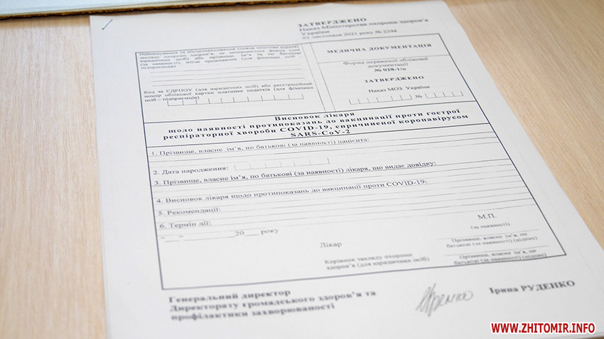Від сьогодні, 9 листопада, житомиряни зможуть отримати довідку про протипоказання до вакцинації від COVID-19. За словами начальниці відділу медико-санітарної допомоги Центру ПМСД Ольги Нестерчук, для того, щоб її отримати потрібно звернутися до свого сімейного лікаря з документами, що підтверджують наявність постійних чи тимчасових протипоказань до щеплень. Лікар ці документи опрацьовує та передає завідуючому амбулаторії, який вирішує, чи дійсно є підстави для надання такої довідки.