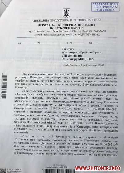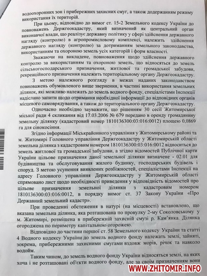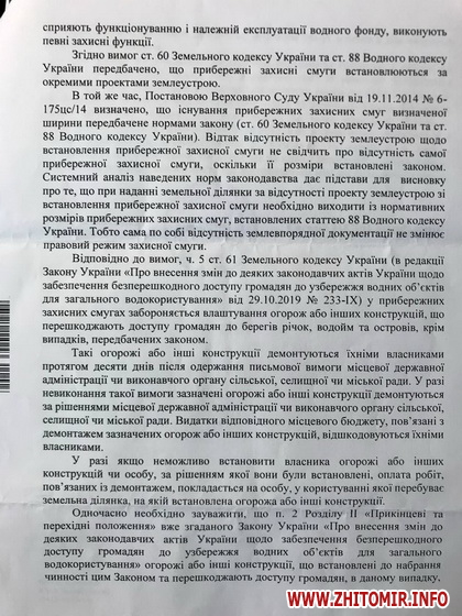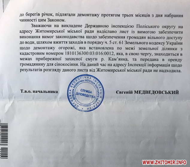 «В результаті проведеної перевірки, екоінспекцією було встановлено факт порушення законності та адресовано до Житомирської міської ради лист із вимогою забезпечити виконання вимог законодавства щодо забезпечення громадян вільного доступу до води, шляхом вжиття заходів в порядку ч.5 ст. 61 Земельного кодексу України щодо демонтажу огорожі, яка встановлена по межі земельної ділянки, яка, в свою чергу, знаходиться в межах прибережної захисної смуги р. Кам‘янка, та передана громадянину для сінокосіння. Цинізмом усієї цієї історії є те, що ми живемо в державі, в якій хтось може перегородити річку, і при цьому всьому органи місцевого самоврядування не вживають ніяких заходів щодо зупинення свавілля! Закликаю Житомирську міську раду терміново навести порядок на усіх водоймах міста та забезпечити безперешкодний доступ громадян до води!», - наголосив депутат районної ради, обраний від виборчого округу N1 (Богунський район м.Житомира).